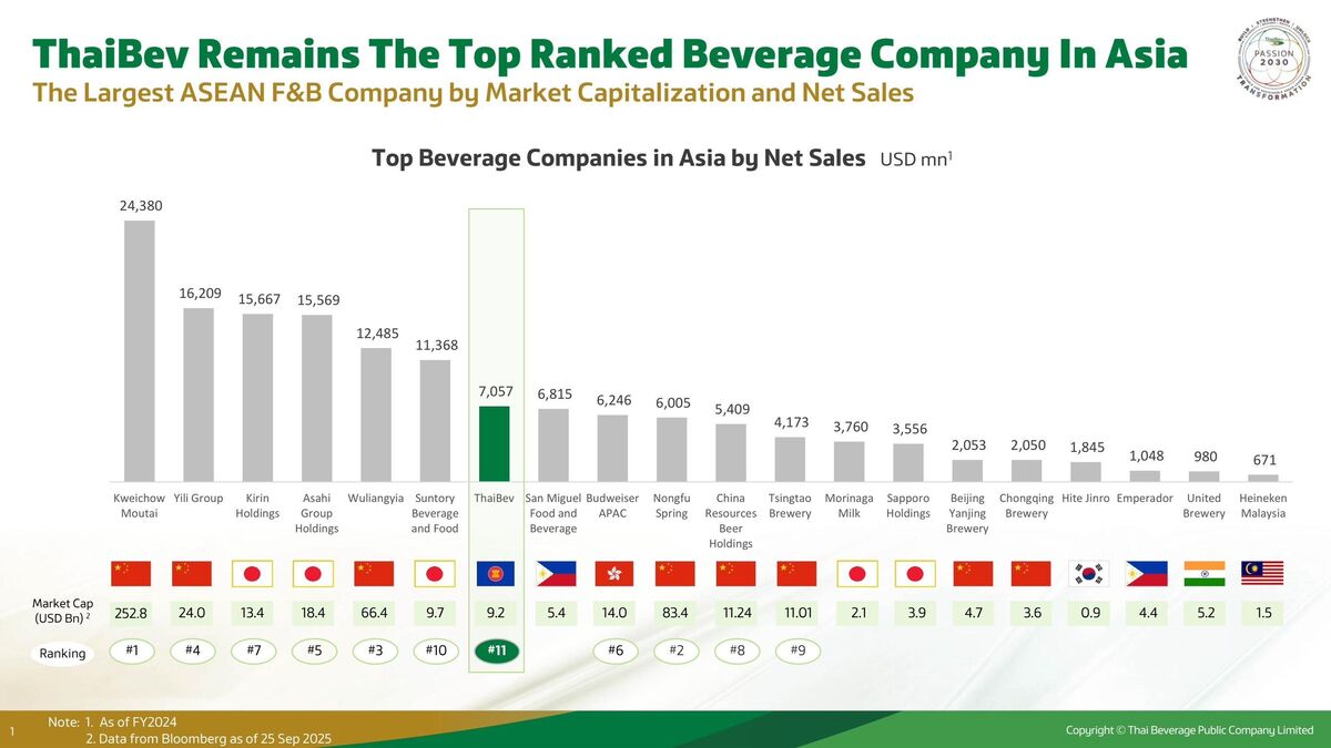 กรุงเทพฯ ประเทศไทย วันที่ 30 กันยายน 2568 – บริษัท ไทยเบฟเวอเรจ จำกัด (มหาชน) (“ไทยเบฟ” หรือ “กลุ่ม”) แถลงทิศทางธุรกิจ พร้อมตอกย้ำความมุ่งมั่นในการเสริมสร้างการเติบโตระยะยาว แม้ภาวะเศรษฐกิจจะยังมีความท้าทาย แต่ไทยเบฟยังคงเดินหน้าพัฒนาองค์กรอย่างต่อเนื่องภายใต้โครงการทรานส์ฟอร์เมชัน ควบคู่กับการดำเนินกลยุทธ์เพื่อสร้างการเติบโตในระยะยาว โดยหนึ่งในก้าวสำคัญที่เสริมแกร่งธุรกิจของกลุ่มในปีที่ผ่านมา คือ การผนวกรวมธุรกิจและการดำเนินงานของบริษัท เฟรเซอร์ แอนด์ นีฟ, ลิมิเต็ด (“F&N”) ผู้ผลิตสินค้าอุปโภคบริโภคชั้นนำในเอเชียตะวันออกเฉียงใต้ เข้ามาเป็นส่วนหนึ่งของกลุ่ม และการประกาศแผนการดำเนินงานภายใต้ PASSION 2030 เพื่อขับเคลื่อนการเติบโตที่ยั่งยืน