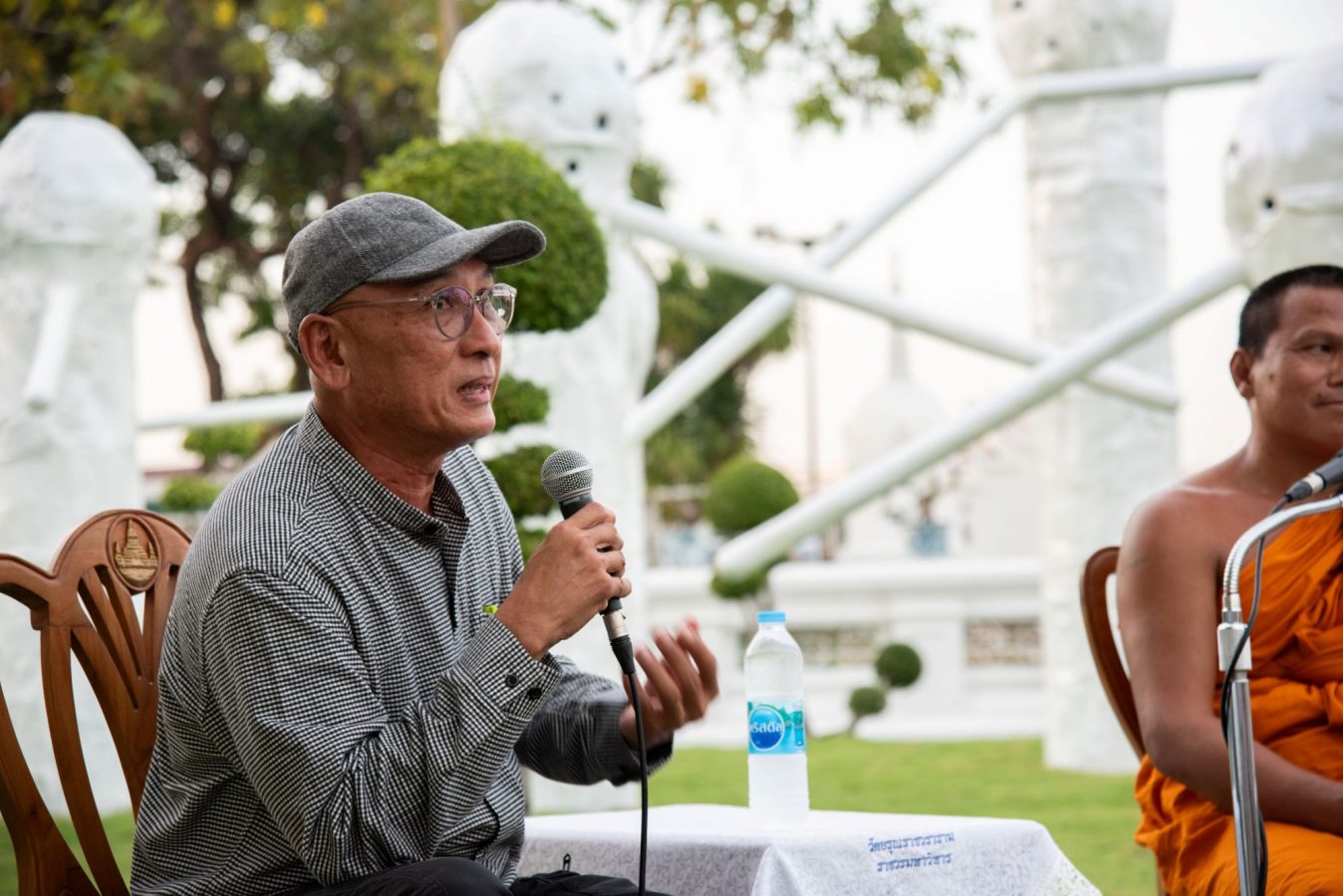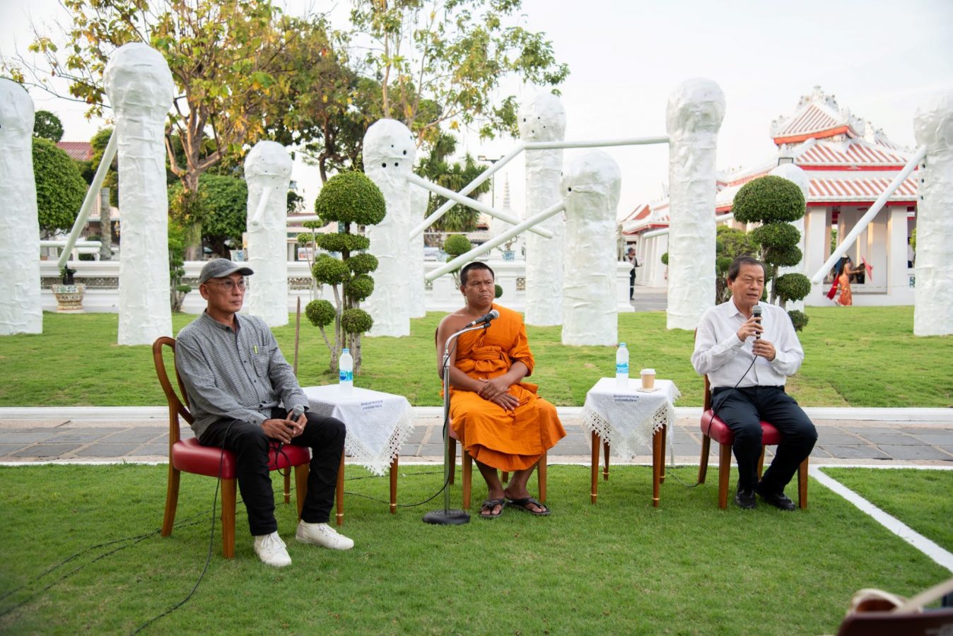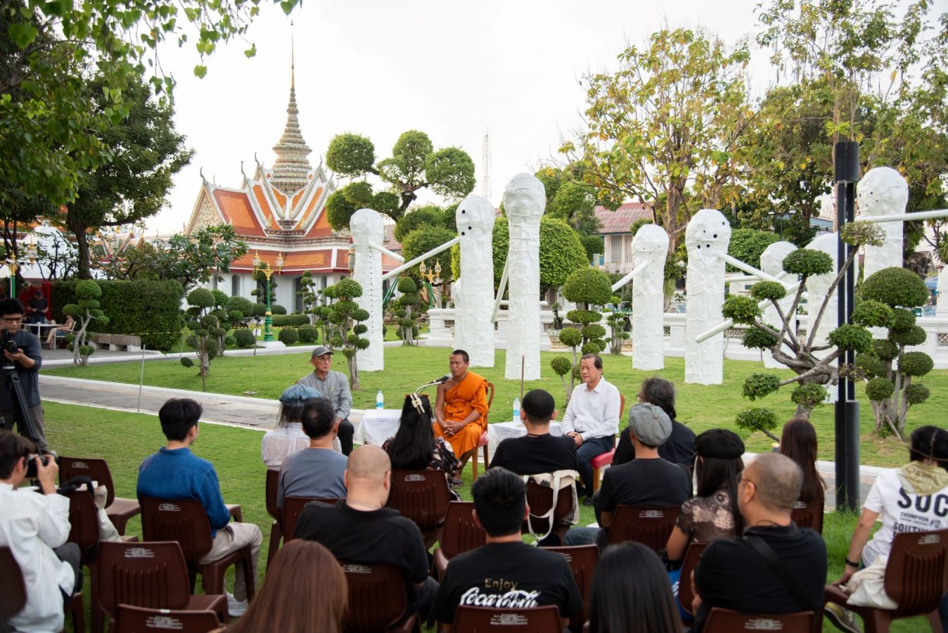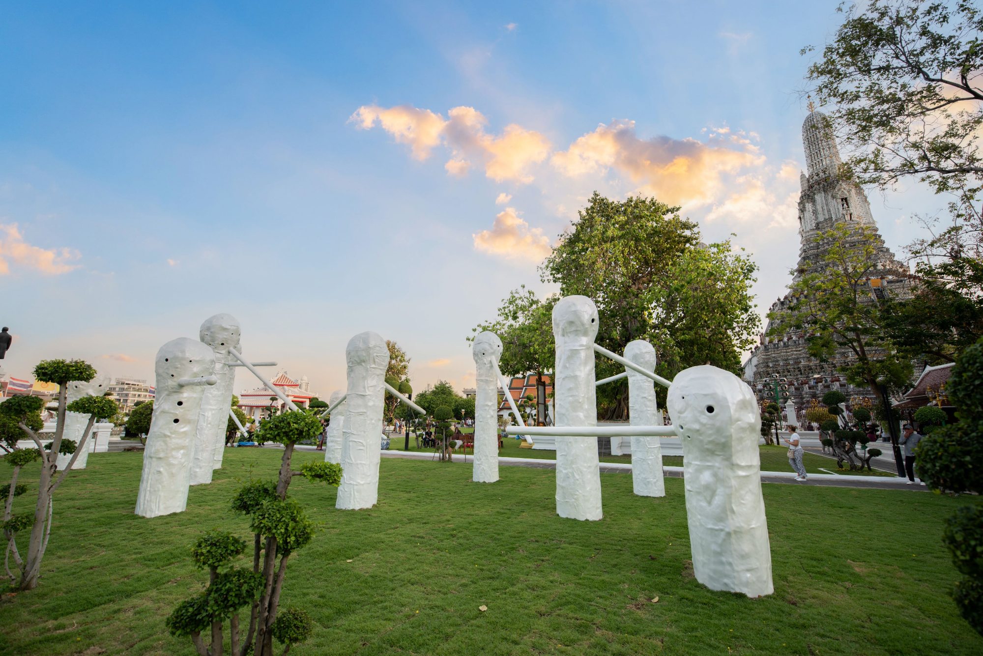 “The Horde” กลุ่มประติมากรรมไฟเบอร์กลาส 15 ชิ้น สูง 2-5 เมตร จัดวางเป็นกลุ่มคนโต้ตอบกัน และก่อพื้นที่ให้คนเดินเข้าไปเที่ยวชมได้ รูปปั้นยักษ์คล้ายสิ่งมีชีวิต เช่น เห็ดงอกจากพื้น ทุกชีวิตมีรู มีตำหนิ มีจุดบกพร่อง และมีจมูกยาวคล้ายดาบ สร้างบทสนทนาและความตึงเครียดระหว่างกันอย่างเงียบๆ โดยงานศิลปะจัดวางชุดนี้สร้างสำหรับสวนของวัดอรุณราชวรารามราชวรมหาวิหาร โดยเฉพาะ เขาศึกษาพุทธศาสนาอย่างจริงจัง และมักแทรกแนวคิดทางพุทธศาสนาในผลงาน ทุกชิ้นเคลือบด้วยสีขาวประกายวาว แตกต่างและล้อกับแสงโดยรอบ และสะท้อนโทนสีขาวของวัด