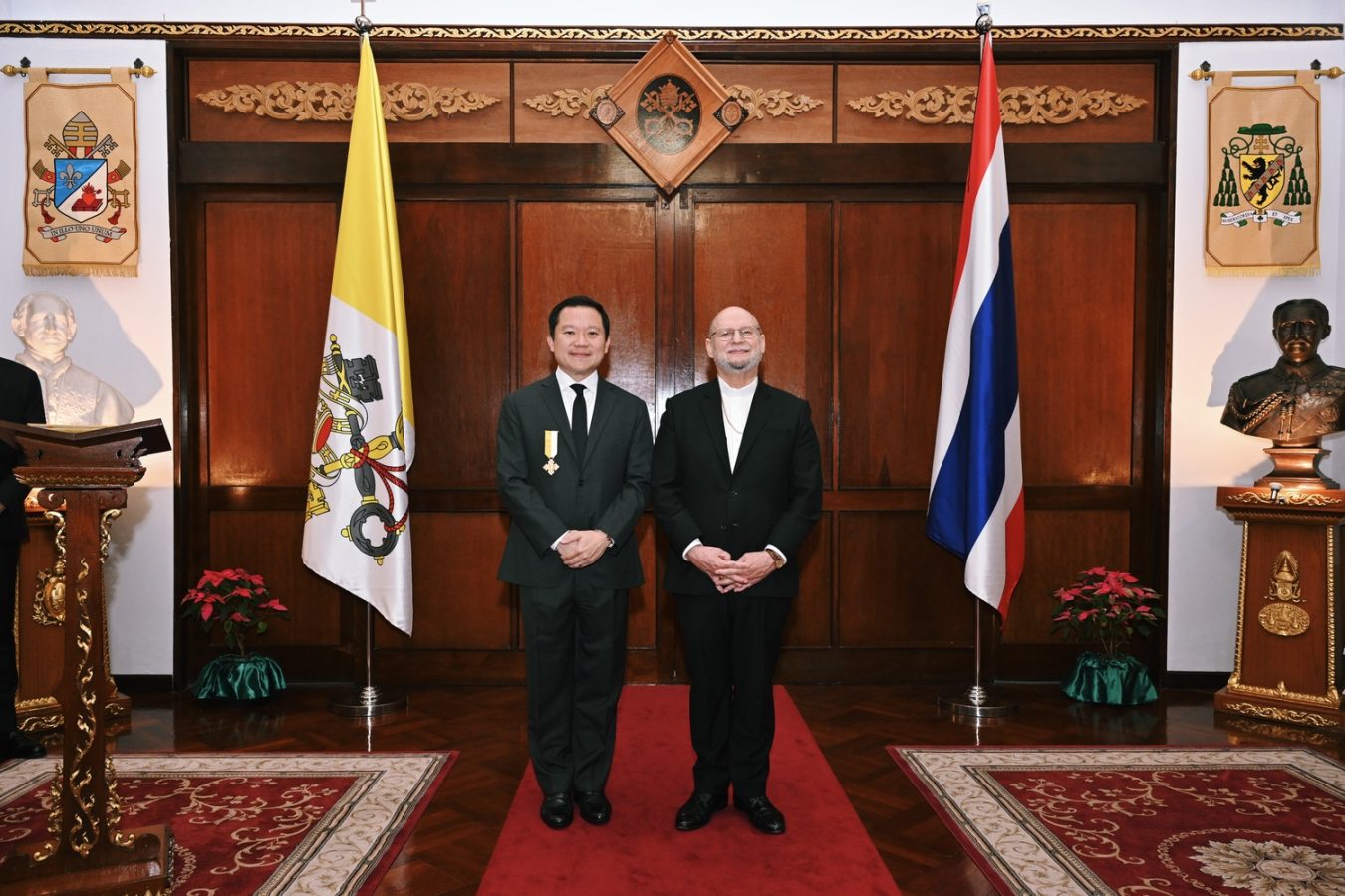 คุณฐาปน สิริวัฒนภักดี ประธานเจ้าหน้าที่บริหาร บริษัท ไทยเบฟเวอเรจ จำกัด (มหาชน) เข้ารับพระราชทานเครื่องราชอิสริยาภรณ์ Benemerenti จากสมเด็จพระสันตะปาปาเลโอที่ 14 โดยมี อาร์ชบิชอป ปีเตอร์ ไบรอัน เวลส์ เอกอัครสมณทูตแห่งนครรัฐวาติกันประจำประเทศไทย เป็นผู้แทนในพิธีมอบ ในโอกาสนี้ยังมี อาร์ชบิชอป ฟรังซิสเซเวียร์ วีระ อาภรณ์รัตน์ ประมุขแห่งอัครสังฆมณฑลกรุงเทพฯ คุณปภัชญา สิริวัฒนภักดี พร้อมด้วยคณะที่ปรึกษาและผู้บริหาร บริษัท ไทยเบฟเวอเรจ จำกัด (มหาชน) ร่วมแสดงความยินดีในพิธีดังกล่าว ณ สถานเอกอัครสมณทูตนครรัฐวาติกันประจำประเทศไทย เมื่อวันเสาร์ที่ 6 ธันวาคม 2568 ที่ผ่านมา